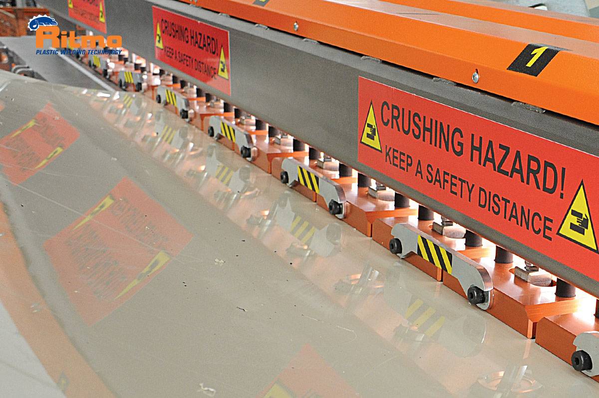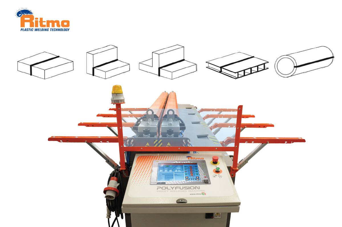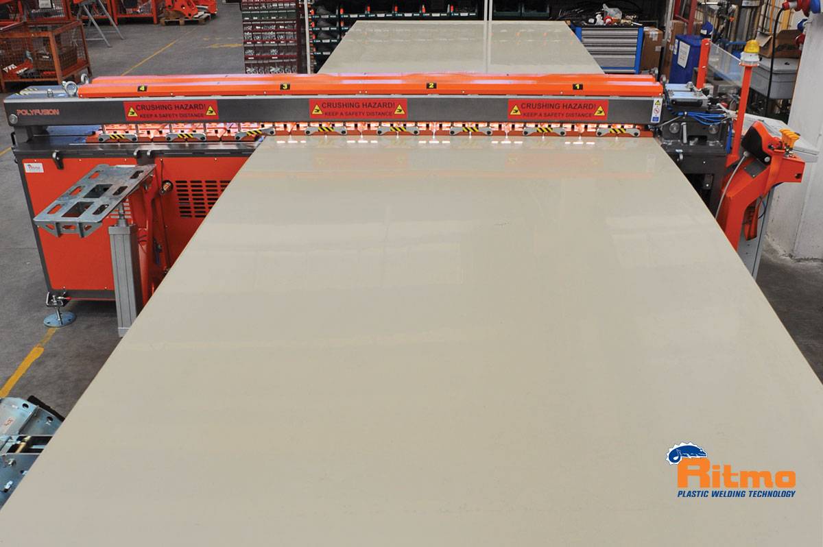 Matériaux soudables: plaques solides de PVC, PE, PP, PVDF; plaques alvéolaires en PE et PP et plage de travail de 3 ÷ 50 mm pour les plaques pleines (pour plus de détails, contacter RITMO S.P.A); plaques alvéolaires max 60 mm.